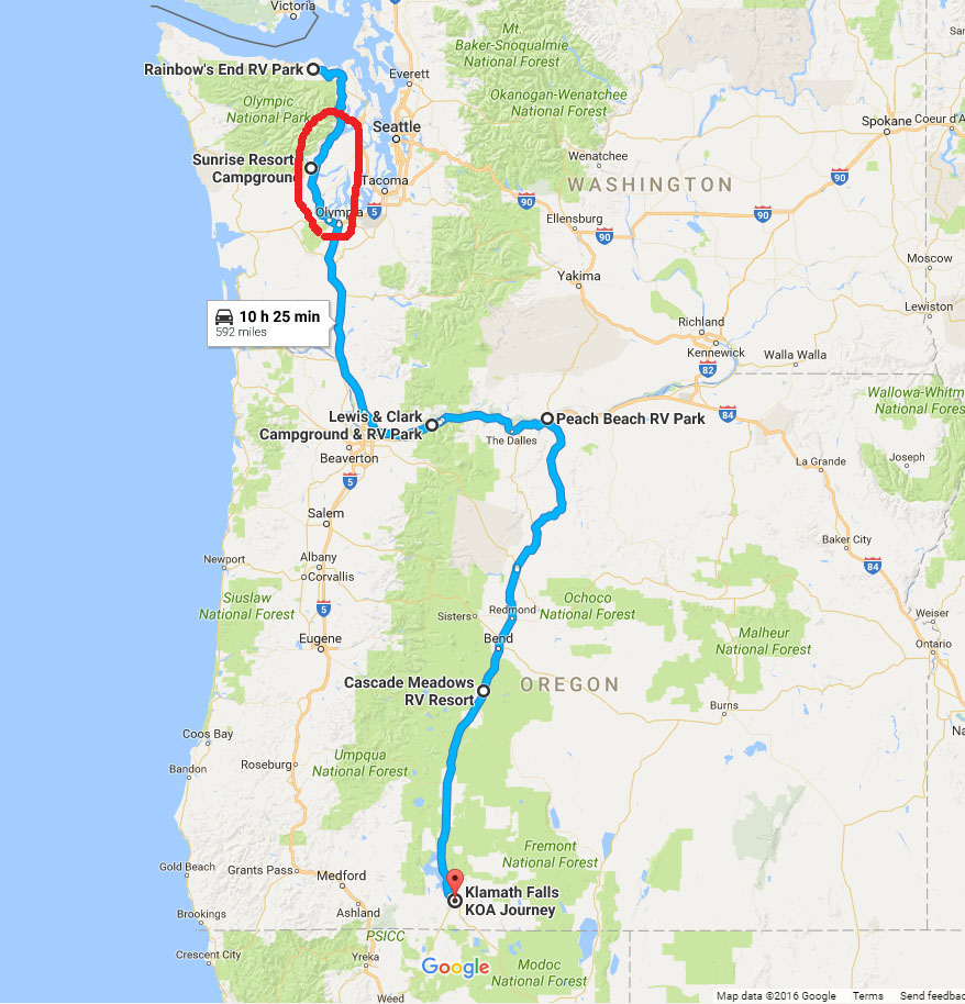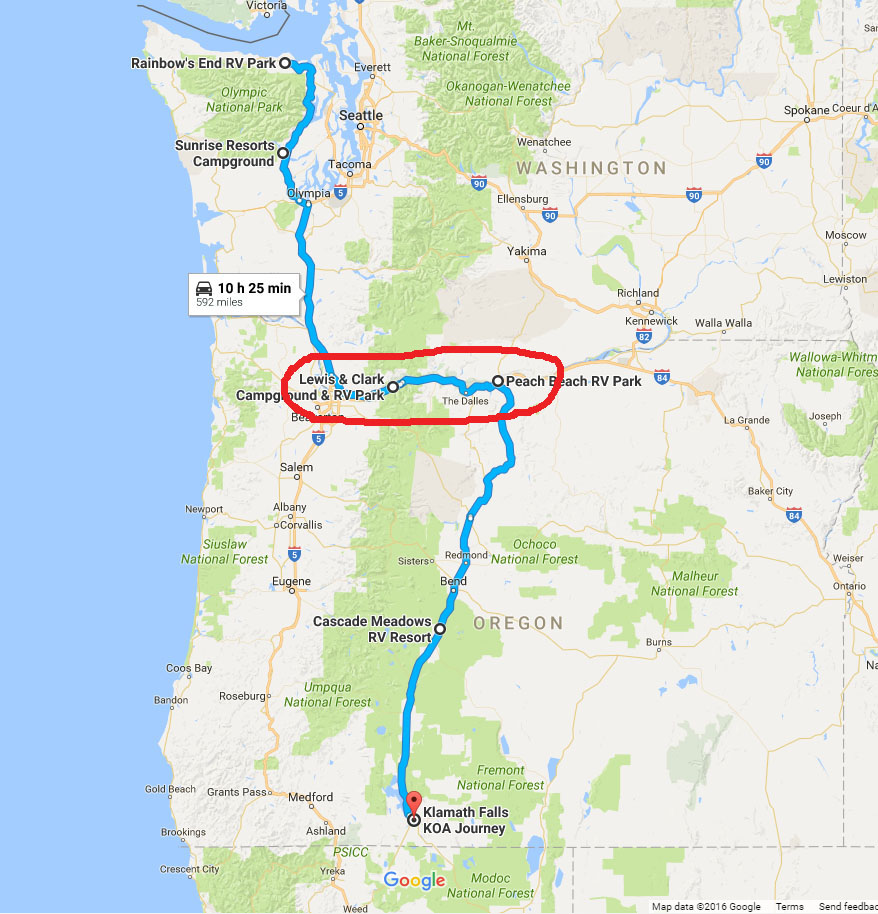 From Hoodsport, Washington, we made our way south to the Columbia River Gorge. Most of our route was on Interstate 5, so the drive went quickly. We did have rain, heavy at times, for most of the drive until just before we reached the gorge. We just drove a little slower than usual and had no problems along the route.