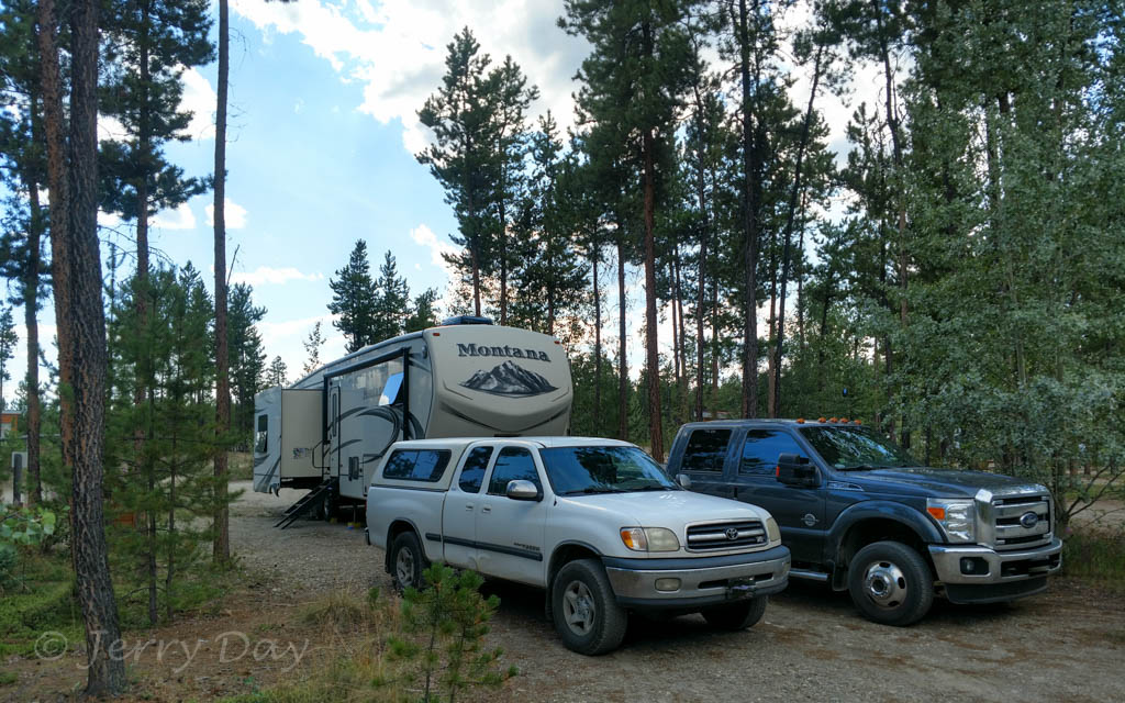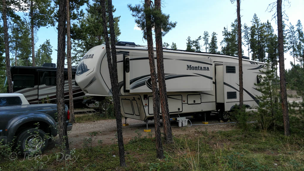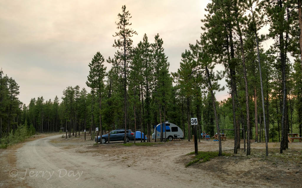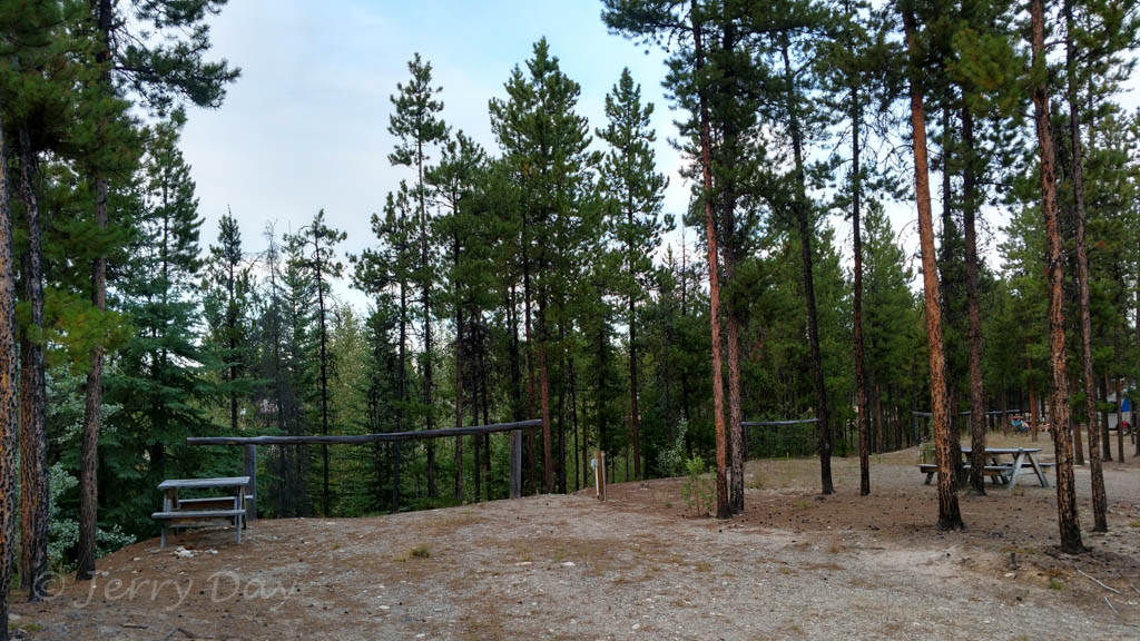 RV sites have partial (water/electric) hookups, cable TV, and picnic table. Electric service is 50/30 or 30/15 amp. Forested sites are mostly level gravel, with good separation between sites. The campground also has a large area for group, overflow and caravan sites – basically a parking lot with hookups. The campground has back-in and pull-thru sites.