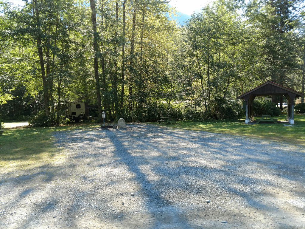 RV Sites have full or partial (water/electric) hookups, cable TV, and a picnic table. Electric service is 30/20 amp. The campground has back-in and pull-thru sites. Sites are level gravel. Most back-in sites have good separation between sites.