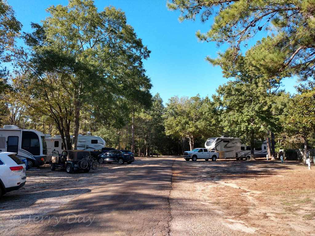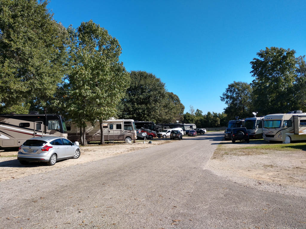For two-weeks at a 50 amp full hookup gravel back-in site in the Rainbow Oaks Section, we paid about $23 per night including $2/day 50 amp service charge, Escapees member rate, and tax. There were no additional fees for pets or an extra vehicle.