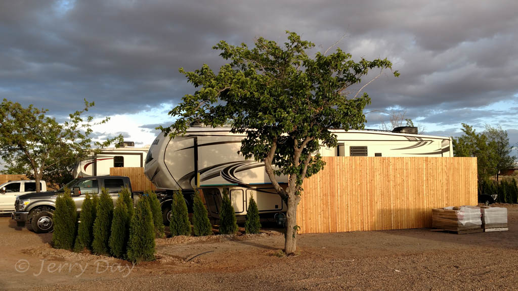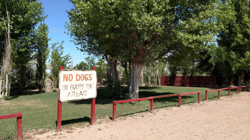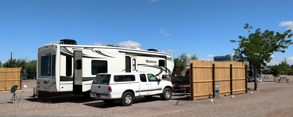 RV sites are very basic, including only the full or partial hookups with 50/30/20 amp electric, cable TV and a picnic table. Sites are level, surfaced with gravel, and have a picnic table. Sites are wide enough to accommodate slide-outs and awnings, but otherwise have little separation between sites. Most RV sites have a small shade tree, but sites still feel very barren & desert-like.