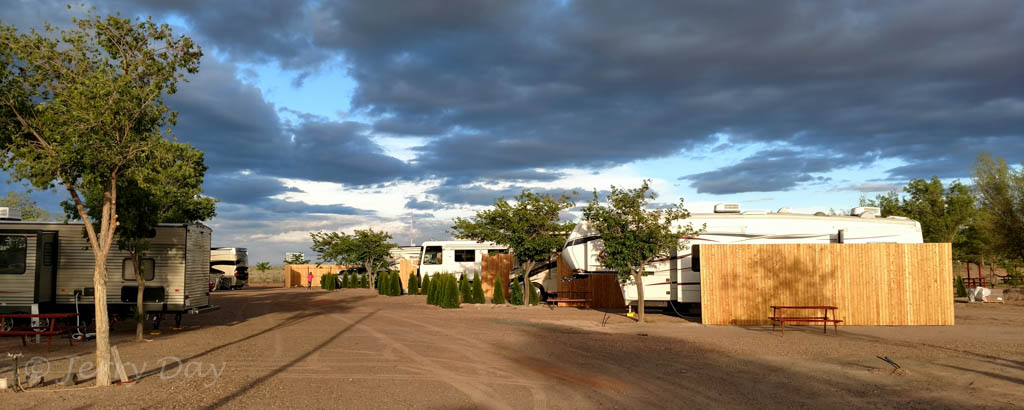 The campground is nicely landscaped, but the area around the campground is a stark mix of barren desert, light industrial and rural properties, and interstate.