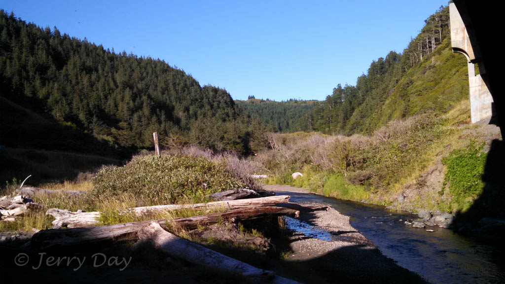 Nestled in a deep forested valley between mountains, right next to a small creek and just a short distance from the Pacific Ocean, the campground is quite scenic.