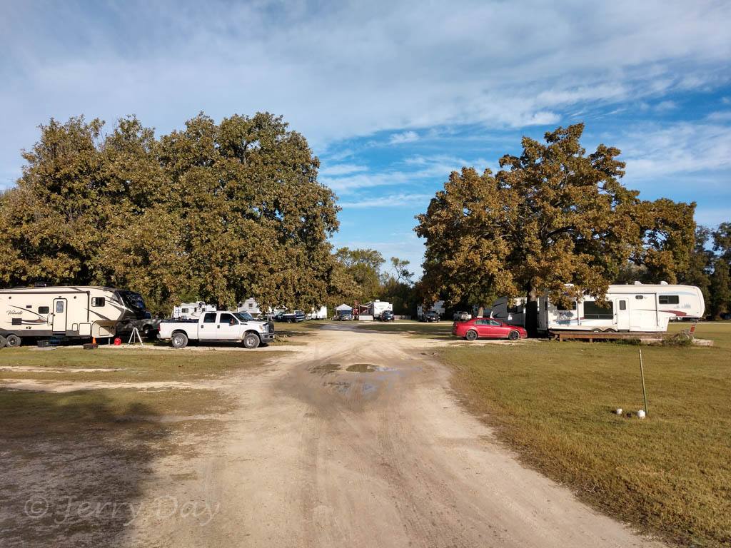 The campground is accessible only from the east-bound lane of divided highway TX-6. Lanes in the park are reasonably well-maintained gravel, although several areas have mud puddles and ruts after rain and could use attention. The park has pull-thru or back-in RV sites and can accommodate large rigs. The campground facilities have some provisions for Universal access.