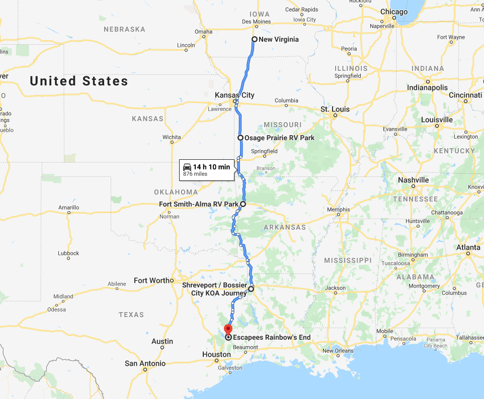 We decided to head south to our domicile in Livingston, Texas, to update our drivers licenses to the mandated Real ID cards. We chose a more scenic route that took us through Missouri, Arkansas, and Louisiana with two-night stays in each state, respectively. (Add three more stickers to the travel map!)