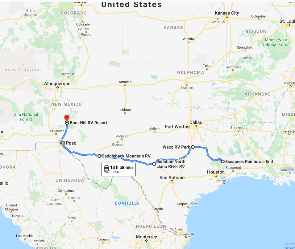 Leaving Waco, we headed south and west towards Alamogordo, New Mexico. Along the way we stopped for two-night stays in Junction and Saragosa, Texas.