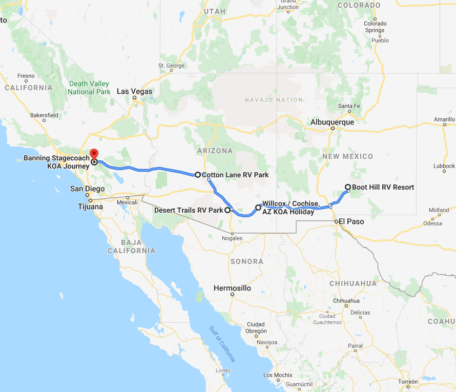 We spent one last day on the road driving to Southern California where we planned to overwinter. With a sigh of relief we checked into the Banning Stagecoach KOA – glad to have successfully completed another great travel season. Whew!