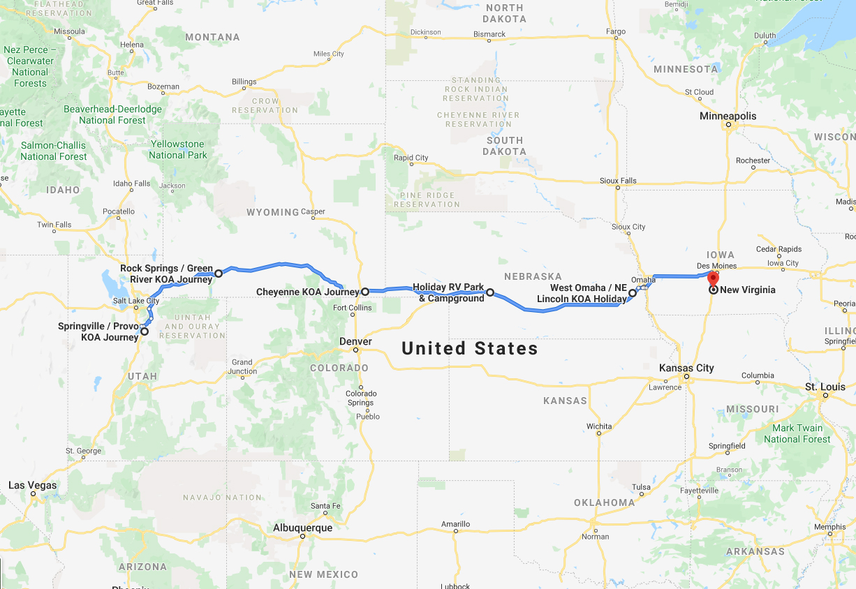 (Mid August – mid October, 2019) Bidding farewell to friends in the Salt Lake City area, we set our sights on our next major goal – visiting family and friends in Iowa. From Provo we cut through the scenic Wasatch Mountains via Provo Canyon and soon merged onto Interstate I-80 for a straight shot east to Iowa.
