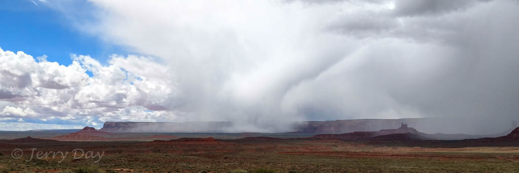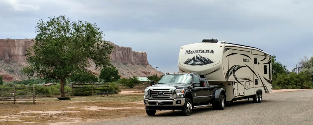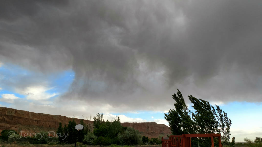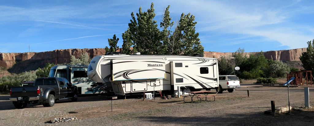 Our drive from Holbrook passed through the lovely desert country of the Hopi and Navajo reservations and was largely uneventful, other than a very rough highway surface on Indian Route 15. IR-15 cuts across from state highway AZ-77 to US-191 and is reasonably well maintained black top, except for many expansion cracks in the surface. At times, our trailer was taking a pounding as we hit these cracks. Upon arriving in Bluff, I checked the trailer interior for damage and found that the bottom of one of our overhead storage cabinets had broken through. There had been too many heavy books in the cabinet and the shelf bottom did not survive the pounding. The shelf units are only stapled together and the staples and materials are too weak to hold under the weight and conditions.