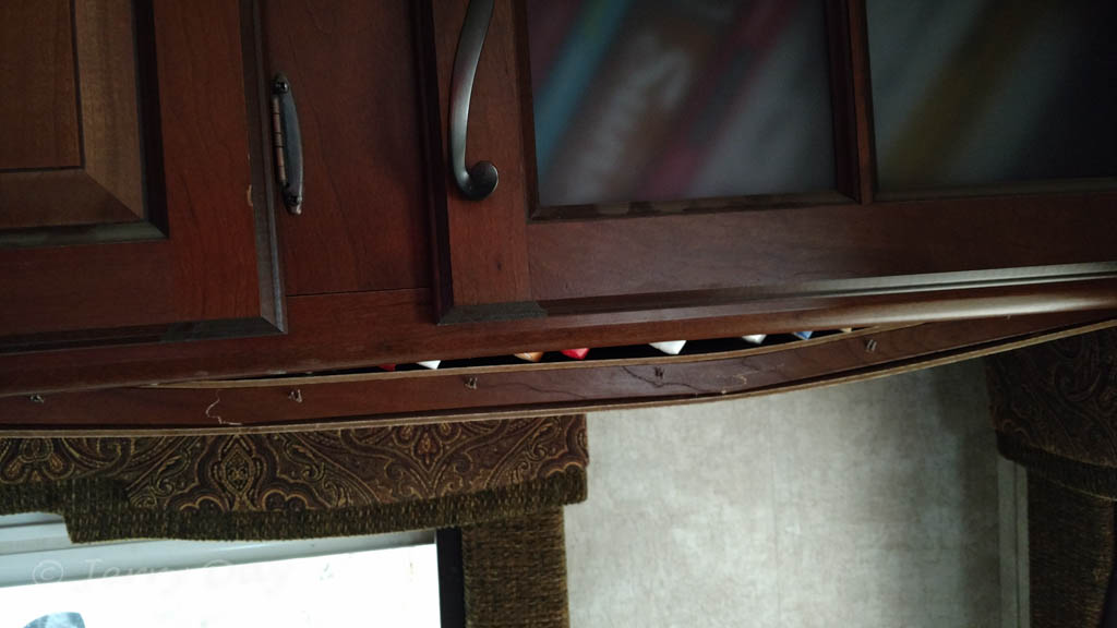 I later moved the heaviest books into a Tupperware storage container in one of our trucks and purchased a pneumatic staple gun in Cortez to repair the shelf. The repair isn’t pretty, but it works. I also used the staple gun to repair a strip on the sliding closet door in our bedroom which had worked loose several times.
