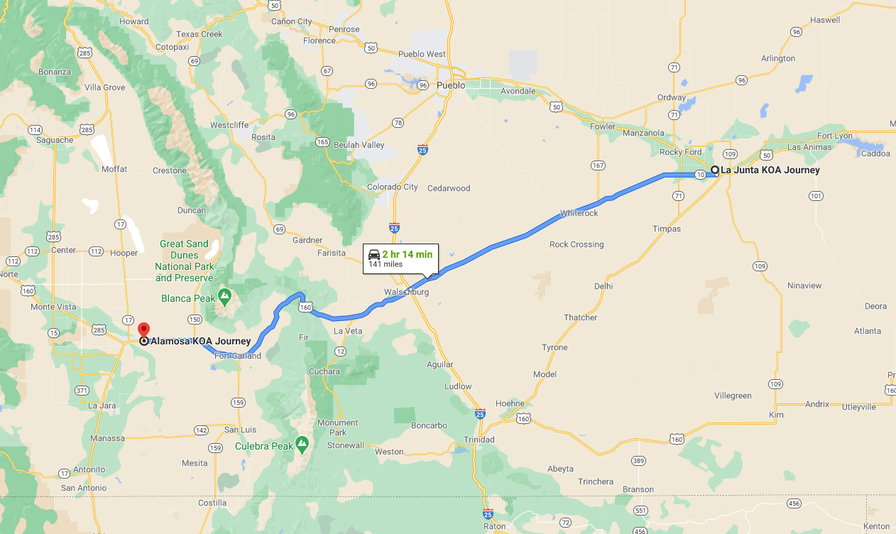 On one visit I drove the Primitive Road from the dunes through the Medano Pass. Then looping through Gardner, Walsenburg, and back to Alamosa. Total round trip distance the campground was about 163 miles.