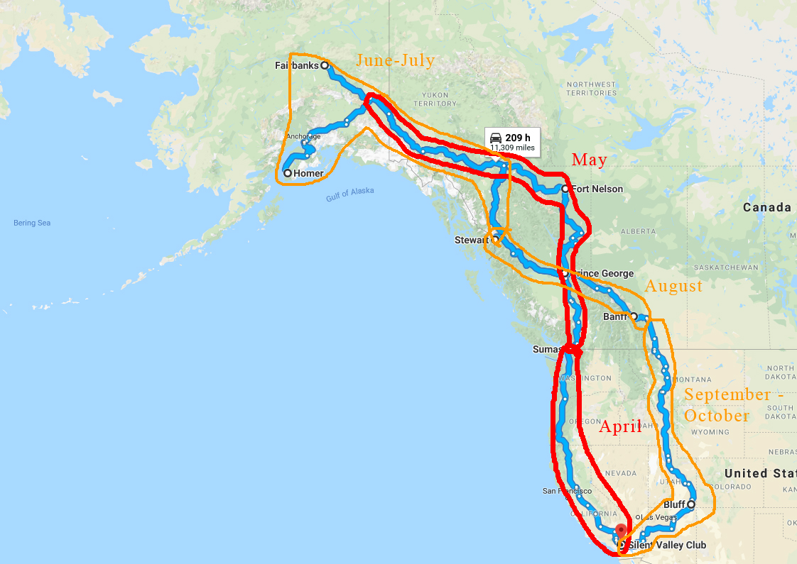 By May 1st, we plan to cross into Canada and spend a month passing through British Columbia and the Yukon Territory. We plan to spend June and July in Alaska, visiting Tok, Fairbanks, Denali, Anchorage, and many places on the Kenai Peninsula. By August we will be making our way back through Yukon Territory and British Columbia. If the forest fires are not too bad this season, we plan to visit Alberta, with stops in Jasper, Lake Louise, and Banff. We will be back in the US by September and working our way south for a return to SoCal in early November.